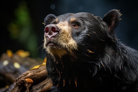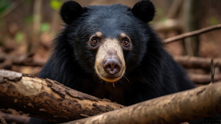 Closeup to the face of an adult Formosa Black Bear holding a wooden stick with the claws in the forest. Ursus Thibetanus Formosanus