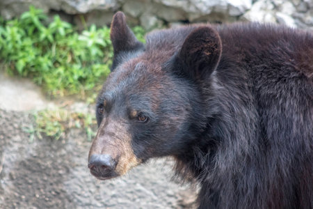 Beautiful portrait of The Asian black bear (Ursus thibetanus) with round ears and white chest patch in the shape of a V