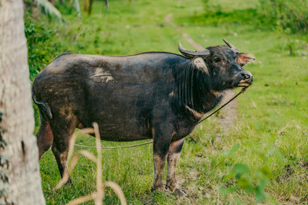 Beautiful medium size black Asian water buffalo in local dairy farm in Southeast Asia, Laos or Thailand