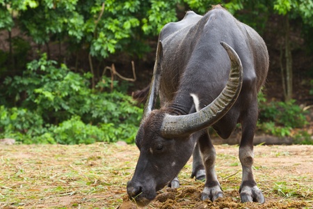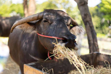 Thai buffalo eats hay in the pen.