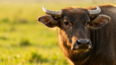 Closeup image of Buffalo with blurred green grass background