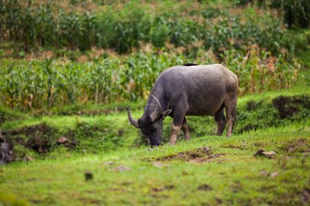 Black of buffalo is eating a green grass on hill with farm background located at north of Vietnam
