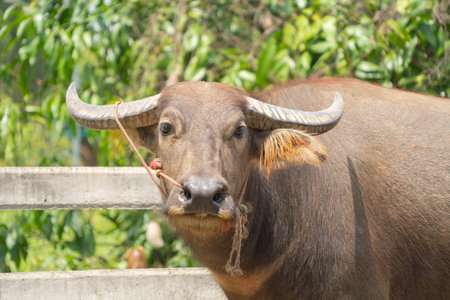 Portrait of asian big battle buffalo in paddock