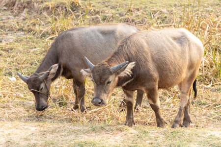 Thai Buffalo eating dry grass in a farm field. Animals in agriculture.