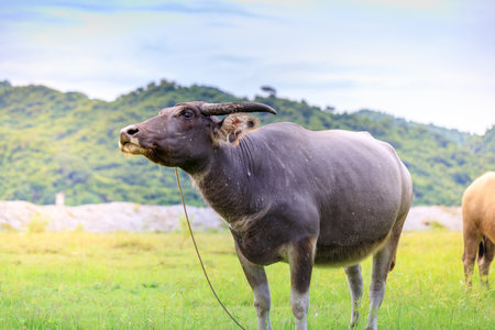 Water Buffalo Standing graze rice grass field meadow sun, forested mountains background, clear sky. Landscape scenery, beauty of nature animals concept summer day