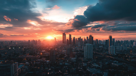 A breathtaking sunset view showcasing a metropolitan city's skyline with illuminated skyscrapers under a vibrant orange and purple sky. The city is bustling with lights as day turns to night and the river glistens below.