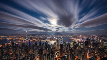 This photograph captures a cityscape at night with illuminated buildings. Long exposure photography reveals streaks of clouds across the sky. The composition emphasizes depth, with lights creating a captivating visual experience. The setting appears to be outdoors under a night sky.