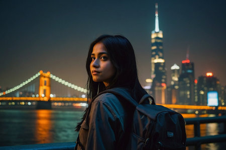 Portrait of a beautiful young Asian woman at night in Shanghai, China