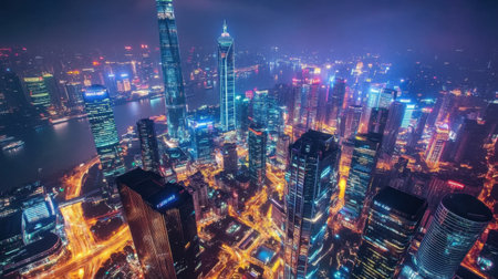This photo captures a sweeping birds-eye view of a bustling city at night, as seen from atop a towering skyscraper, Shanghai's skyline from a bird's eye view at night, AI Generated
