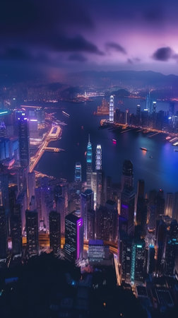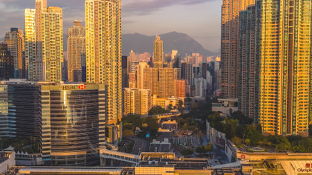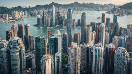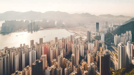 Generative AI : Aerial View of the Tower and financial district with skyscrapers at sunset along the waterfront bay in Hong Kong Island downtown Central and Western District Hong K