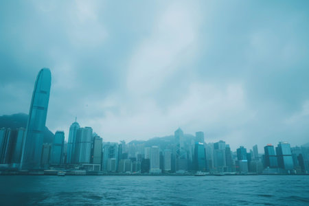 An aerial view presents a city skyline, with numerous skyscrapers and buildings. The image features a cool color palette with muted tones. A layer of mist obscures some buildings. Suitable for commercial applications, this image can be used to represent urban landscapes and city life.