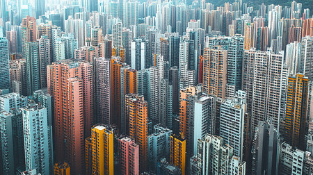 Vibrant skyline of densely packed buildings in a bustling urban area