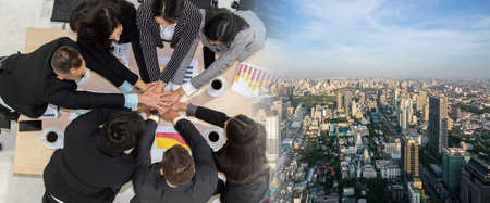 Happy business people celebrate teamwork success together with joy at office table shot from top view . Young businessman and businesswoman workers express cheerful victory in broaden view .