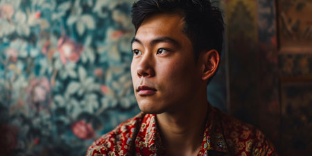 Portrait of a young handsome Asian man in a colorful shirt