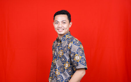 asian man stylish with batik clothes in studio isolated with red background