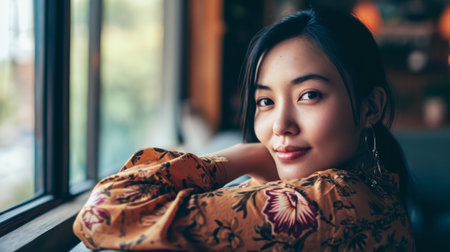 Smiling Asian woman, her expression relaxed and content, set against a vibrant background, reflecting joy and confidence.
