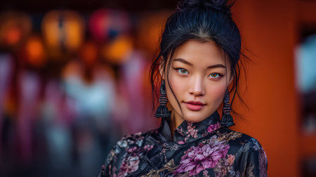 A young woman poses elegantly in traditional attire, adorned with floral patterns. Lanterns glow softly in the background, creating a warm and inviting atmosphere during twilight.