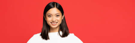 happy and young asian woman in sweater looking at camera isolated on red, banner