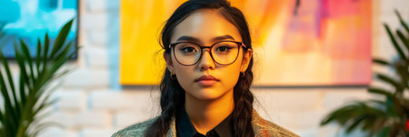 Elegant Woman with Glasses Posing Confidently in a Bright Studio Surrounded by Modern Art Decor