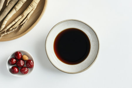 A photograph of traditional Chinese medicine herbs, including ginseng and red dates, in a bowl with black tea liquid on a white background. The composition is centered around the items, creating an overhead view with high resolution and high quality. --ar 3:2 --v 6.1 Job ID: 39c1d761-3a50-400f-8470-1a57b09b12d6