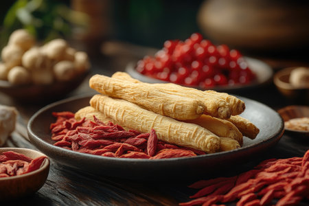Dried dang shen roots and goji berries are laying on a rustic plate, ready for use in traditional Chinese medicine