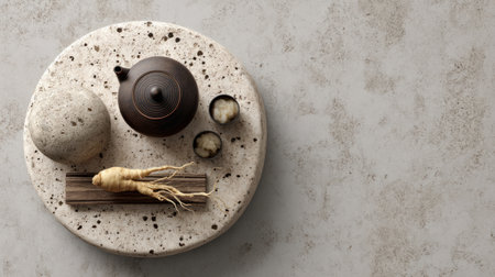 clean stone table with tea pot and ginseng root, neutral daylight, flat lay. Generative AI