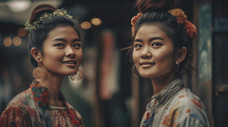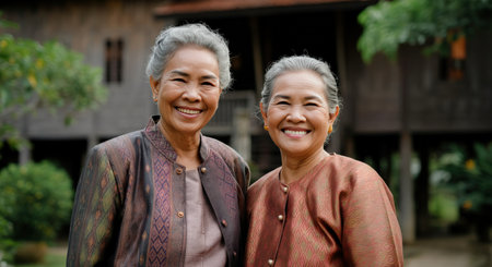 Women share a joyful embrace, showcasing generational bonding in colorful traditional attire. Soft lighting creates a warm ambiance in a cultural environment. Concept of family, heritage, joy.