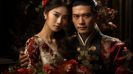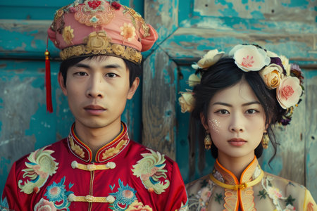 Portrait of a young couple dressed in ornate chinese wedding outfits standing against a vintage blue background
