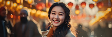 happy asian woman walking on chinese new year street in winter