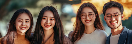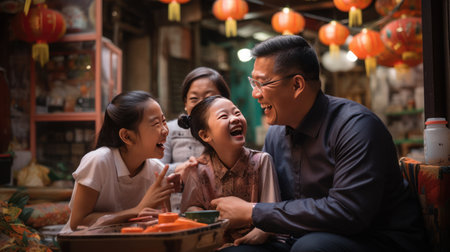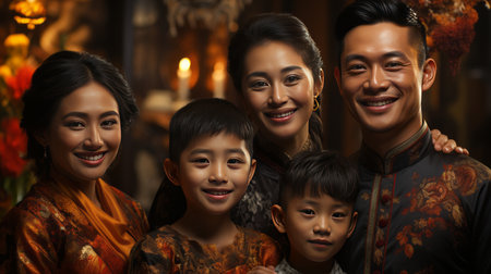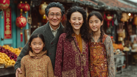 Four asian family members dressed traditionally smiling together in an outdoor cultural ambiance