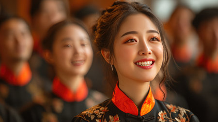 Diverse people in cultural attire, smiling, indoor setting