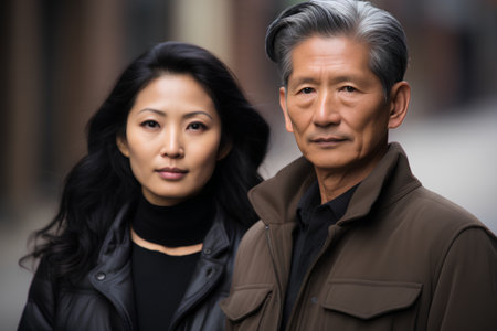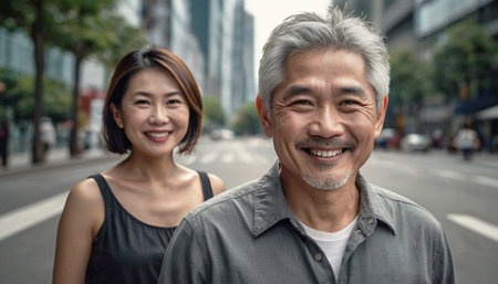Portrait of asian senior couple looking at camera in the city