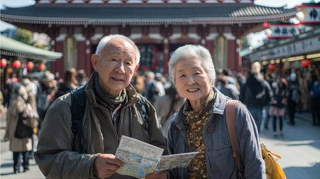 Happy elderly couple holding a map, enjoying their visit to sensoji temple in asakusa, Tokyo, while embracing the vibrant culture and sights