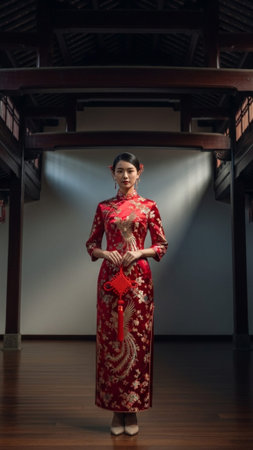 A vertical tall (9:16) full body shot of a woman celebrating Lunar New Year, standing elegantly in a