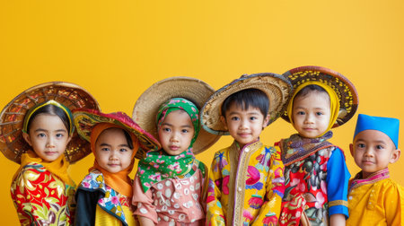 A diverse group of Indonesian children stand together in a bright studio, exuding unity and joy.