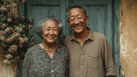 Elderly asian couple, smiling warmly, standing by a weathered door surrounded by plants.
