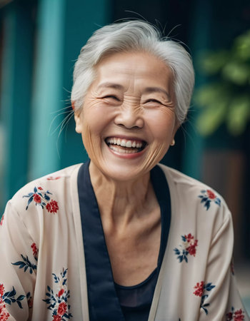 A joyful happy elderly Chinese woman with silver hair beams with delight, reflecting a life filled with experience and happiness. Mongoloid Asian face type. Active pensioner. Generative AI