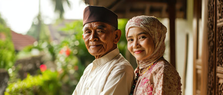 A senior man and a young woman stand together smiling in a lush garden. They wear traditional attire showcasing cultural pride and connection.