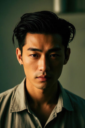 Snapshot of youthful Asian male against backdrop.