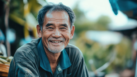 Close-up of a kind Asian man smiling warmly while helping someone in need, illustrating compassion and human connection in a heartfelt act