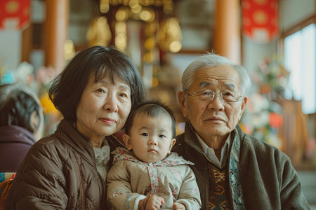 Portrait of asian senior couple with grandchild in chinese temple