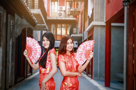 Two Asian women wearing a red traditional Chinese dress. New Year and Chinese New Year Festival