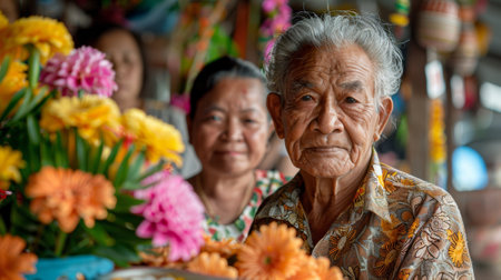 Elderly man with a serene expression crafting floral offerings in a Thai market for Songkran.