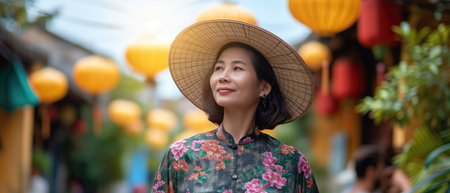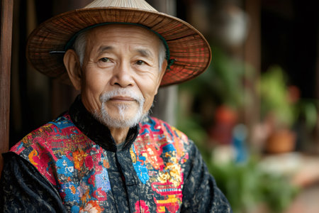 Close up portrait of a smiling senior Vietnamese man wearing a traditional conical hat and colorful shirt, showcasing cultural heritage