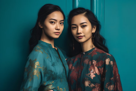 two beautiful asian women in fashion clothes, studio shot on green background