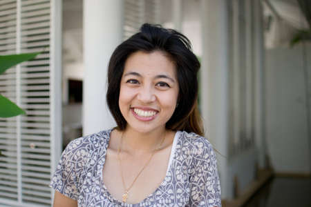 Beautiful Asian woman smiling with outdoor scene.