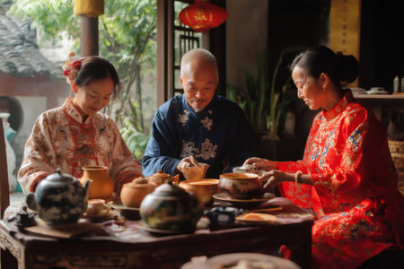 Chinese family traditional wearing clothes performing a tea ceremony in a decorated tea room