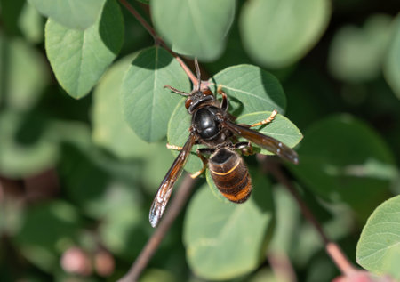 bald-faced hornet with latin name Vespa crabro gathers nectar from a flowering shrub