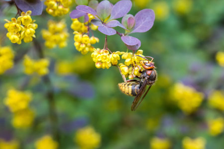 Detailed macro photo of a hornet wasp feeding on bright yellow flowers. Close-up view of the insect's intricate features. Wildlife and nature photography. Perfect for scientific or educational use.