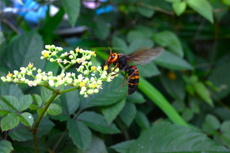 The Japanese variant of the asian giant hornet, Vespa mandarinia, also known as a murder hornet in the United States, rests on the small flowers of bushkiller vines in Yokohama, Japan.